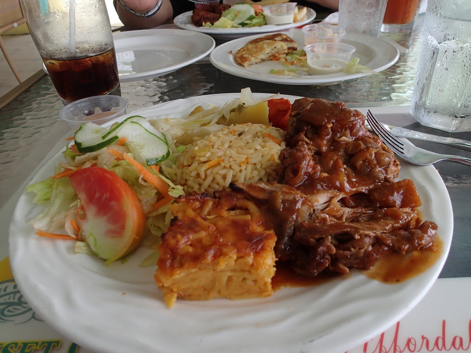 We ate at Sunset Cafe which was part of Timothy Beach Resort. We got Greg’s Special which was Conch Fritters and Rum Punch. The fritters were delicious but the rum punch not so much. I kind of just wanted a cheeseburger and fries but then decided I had to get an authentic meal so I got Stewed Chicken with Macaroni Pie and a Salad. It was pretty good.